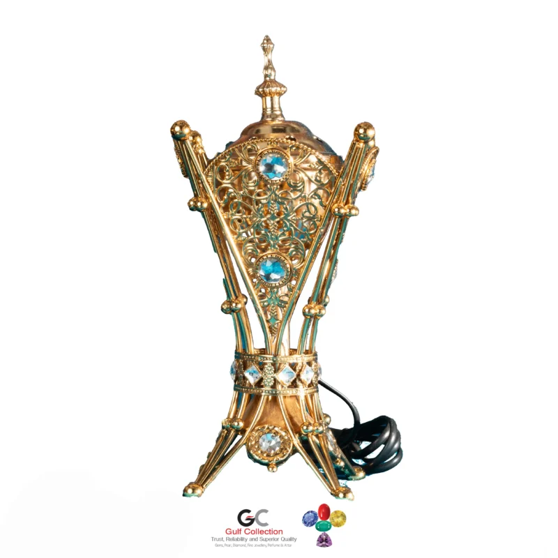 The image shows an ornate Arabian-style polyresin burner, also known as a bakhoor burner, from the Gulf Collection.We strongly believe on quality gemstone, real price and trusted long-term relation. Because our clients are the main capital for our business development.