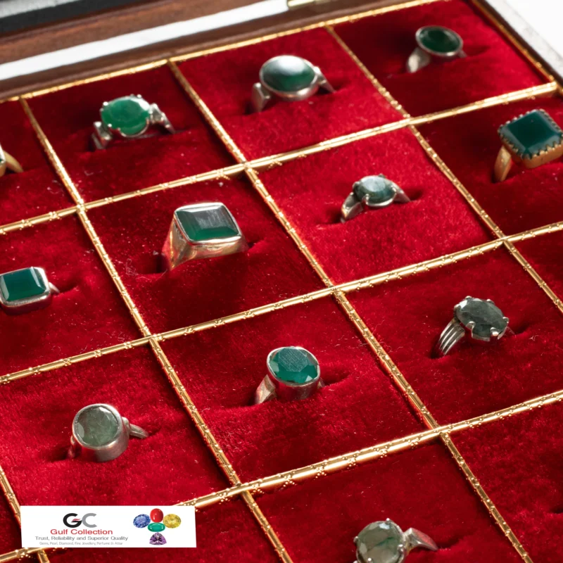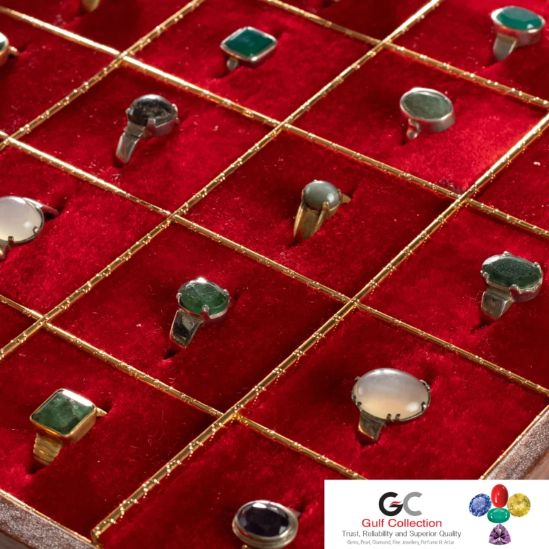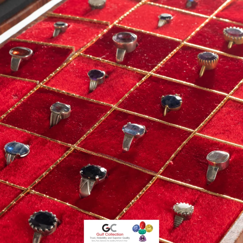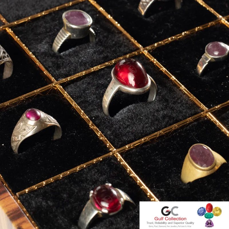 This is a collection of rings featuring red gemstones, such as rubies and garnets, in a display case from Gulf Collection. We strongly believe on quality gemstone, real price and trusted long-term relation. Because our clients are the main capital for our business development.