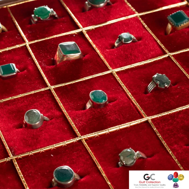 This is a collection of rings featuring red gemstones, such as rubies and garnets, in a display case from Gulf Collection. We strongly believe on quality gemstone, real price and trusted long-term relation. Because our clients are the main capital for our business development.